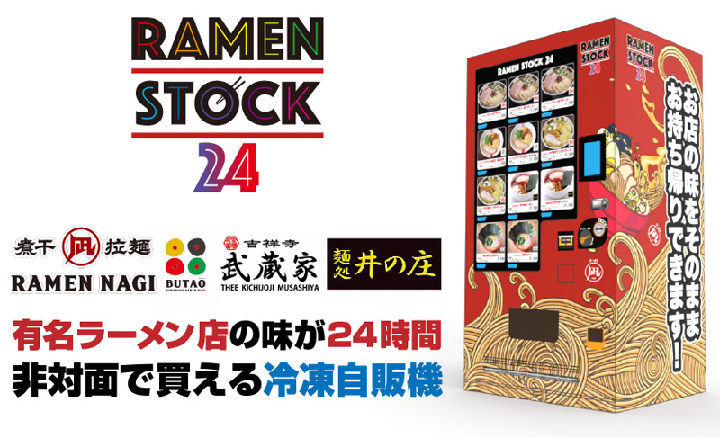 人気店のラーメンをそのまま冷凍!いつでも買える冷凍自販機で提供する「RAMEN STOCK24」ラインナップも豊富でお好きなラーメン店をチョイスして販売をすることが可能です。多様化するエブリタイムなフードスタイルと本物志向のコラボレーションで新しい自販機ビジネスをサポートいたします。